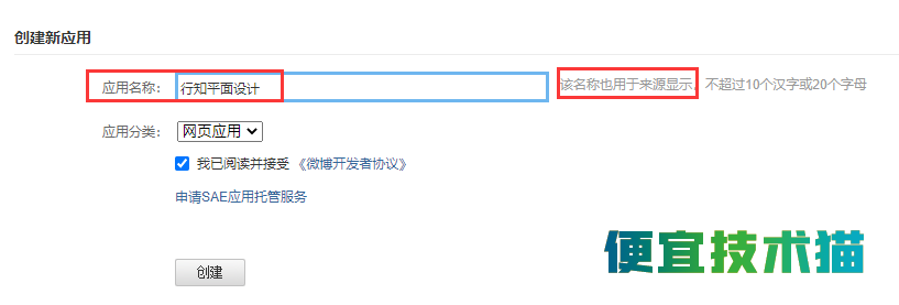 创建新的应用程序,设置应用程序名称,注意,这个名称也可以用来显示来源,应用程序分类选择网页应用程序,如图: